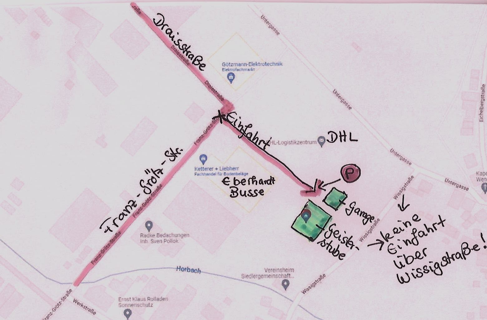Einfahrt zwischen DHL und Eberhardt Busse (über den Hof fahren bis zu unserer Garage). Parken bitte nicht bei den Bussen, sondern auf unserem Parkplatz vor unserer Garage